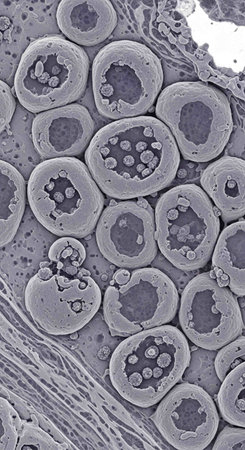 Vibrant close up of cell structures with intricate details showcasing biological activity and texture in a fascinating magnified view.