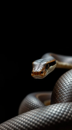 Slithering serpent showcases intricate scales under soft lighting in a dark background