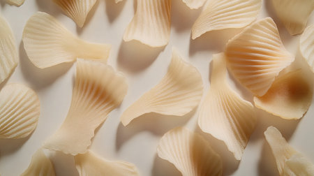 A close-up of ridged potato chips spread out across a white background, highlighting their texture and crispiness.