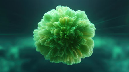 This abstract image features a green organic structure that mimics a blossoming flower, surrounded by a dark background, showcasing delicate textures and gentle illumination.