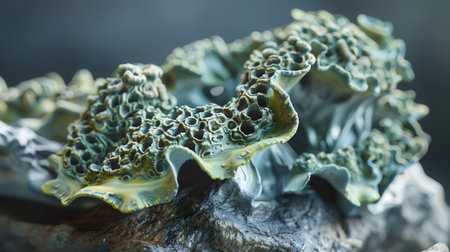 A detailed macro shot showcases a delicate bluegreen lichen with intricate, corallike structures growing on weathered wood.