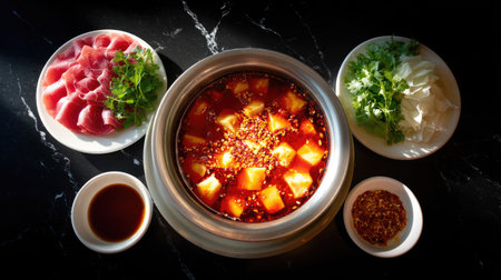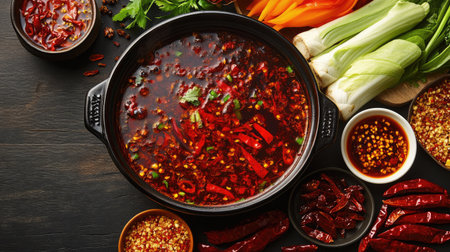 A spicy hot pot bubbling with red chili oil and whole chili peppers, surrounded by fresh vegetables, thinly sliced meats, and dipping sauces for a perfect meal