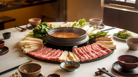 A delicious Shabu-Shabu setup with a hot pot filled with simmering broth, surrounded by plates of fresh vegetables, meat, and tofu.