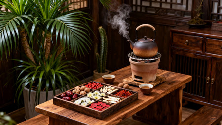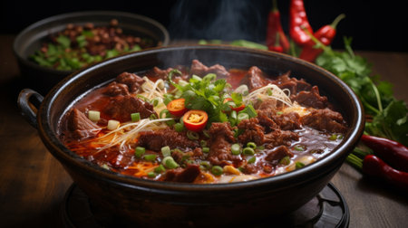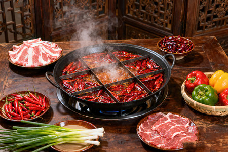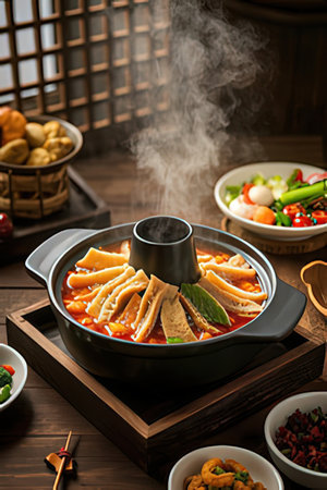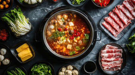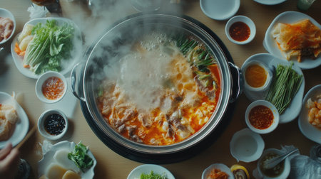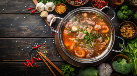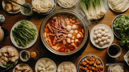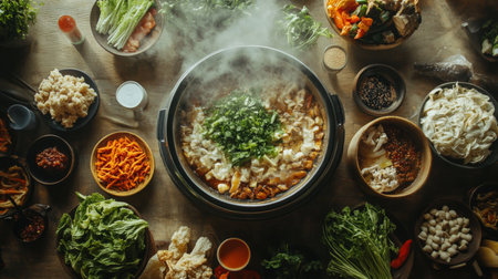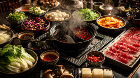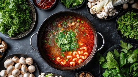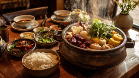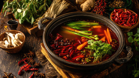 A vibrant and inviting hot pot dish stands at the center of a traditional table, surrounded by fresh vegetables, spices, and condiments, perfect for communal dining.