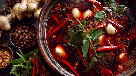 A captivating image of a rich, spicy broth packed with vibrant red chilies, fresh herbs, and aromatic spices, perfect for culinary inspiration.