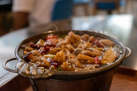Chicken hot pot, with vegetables in soup. served in the restaurant