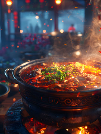 A dynamic shot of a steaming hot pot with a variety of ingredients simmering, set in a cozy dining room with traditional Asian tableware and ambient lighting.