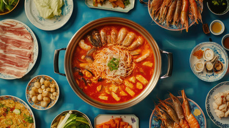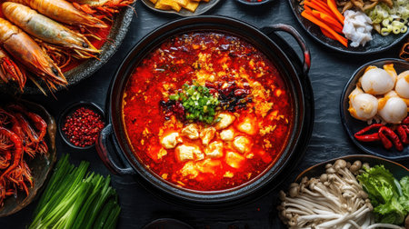 A vibrant table setting featuring a spicy hot pot in the center, with a bright red broth and an assortment of raw ingredients like seafood, vegetables, and noodles