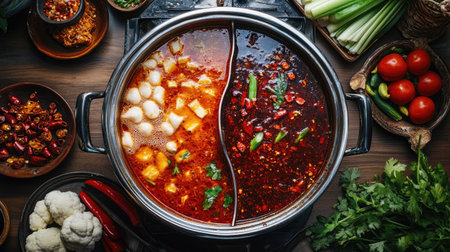 A Sichuan hot pot with a split pot design, one side filled with spicy red broth and the other with a milder white broth, surrounded by fresh herbs and vegetables