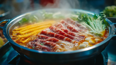 Experience the warmth of a hot pot feast, filled with fresh ingredients and aromatic steam rising from the rich broth, perfect for shared meals with loved ones.