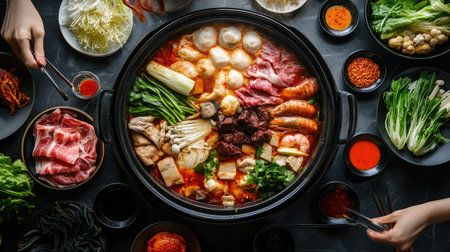 Gathered around a table, friends and family savor a traditional hot pot filled with simmering broth while selecting fresh vegetables, meats, and seafood to cook together
