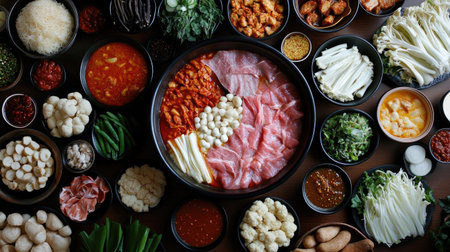A captivating top-down view of a Japanese shabu shabu hotpot, featuring an array of fresh vegetables, mushrooms, and meats arranged beautifully for a communal dining experience.