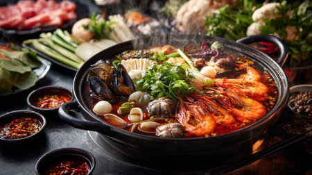 A traditional Asian hot pot filled with bubbling broth and assorted fresh ingredients.