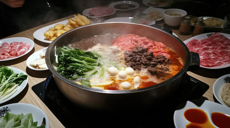 Indulge in a delicious hot pot meal featuring a variety of fresh ingredients and aromatic broth, perfect for gathering and sharing with loved ones.