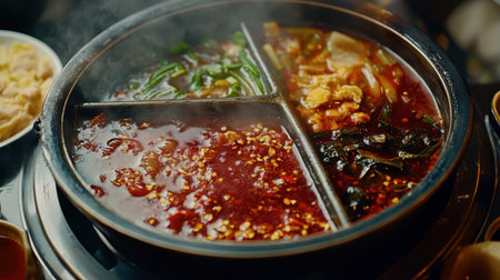 A vibrant hot pot featuring a variety of broths, fresh vegetables, and steaming ingredients, perfect for a cozy dining experience with friends and family.