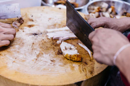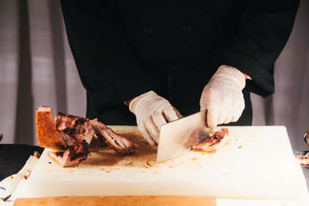 Hands of a male chops roast pork with a cleaver at a holiday party