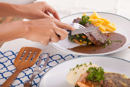 A female hand using knife cutting beef steak decorated with fries in a nice dish set on a table.