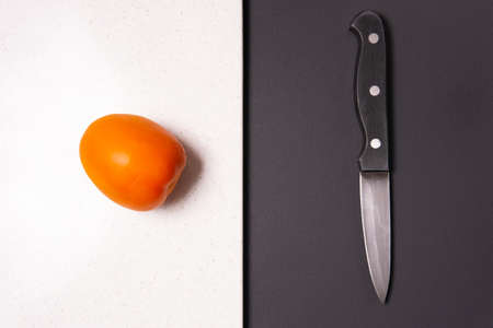 Red tomato and knife on a black background. Kind with a side.