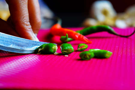 Stock photo of a girl cutting or chopping fresh organic green chili on dark pink color chopping board in the kitchen area at Bangalore, Karnataka, India.Picture captured under natural light.