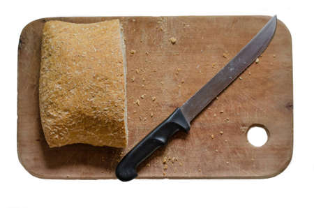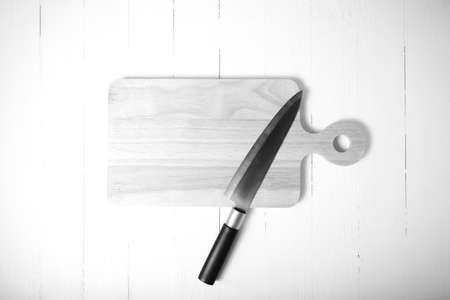 kitchen knife on cutting board over table background black and white tone color style