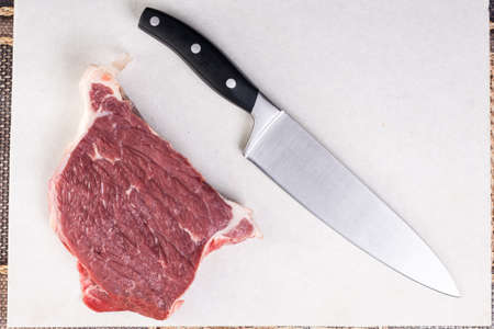 Flat lay overhead view above raw beef steak witk kitchen chef knife on the white marble background table.