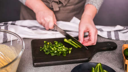 Step by step. Slicing jalapeno peppers for spicy jalapeno cornbread.