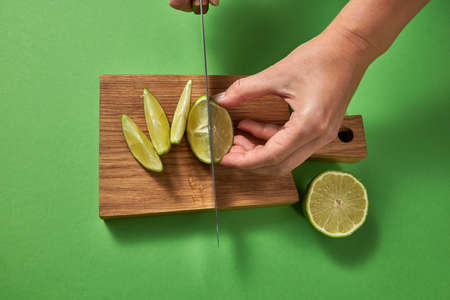 Top view of female cutting a half of green ripe lime with slices on a wooden cutting board on a green background. A sharp knife in her hands.