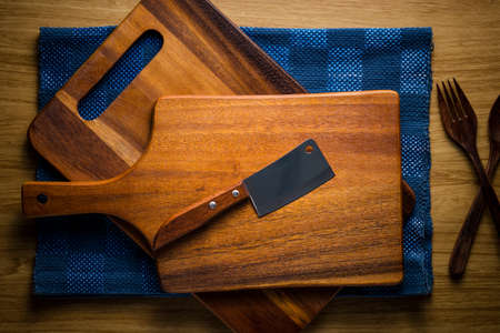 Old meat cleaver and chopping board on dark background, top view with copy space for text