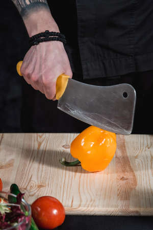 Young attractive man chef in black uniform hands in tattoos chops yellow pepper . black background. no face