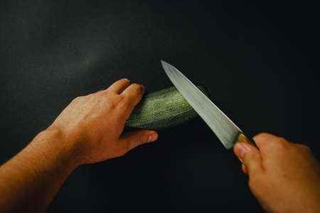 Cutting a cucumber with a long knife