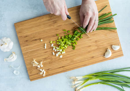 The girl cuts greens, onions, parsley and various seasonings with a knife on a cutting board. Woman cook cuts salad for cooking.