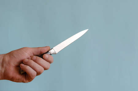 Hand of an adult male holds a sharp knife. A small knife with a black hilt in his left hand. Middle-aged man of European race. Cutlery.