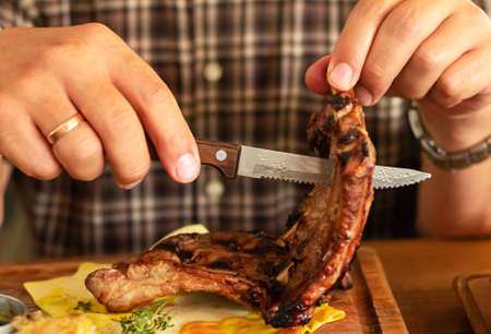 Mens hands cut steak on the wooden board close up