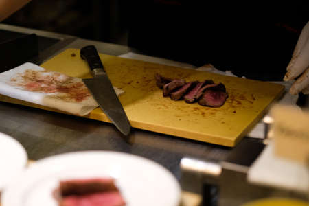 Close up sliced piece of beef steak and knife on wooden board in luxury dinner party