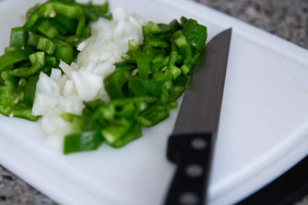 Bell pepper and onion cut with a knife to prepare a meal