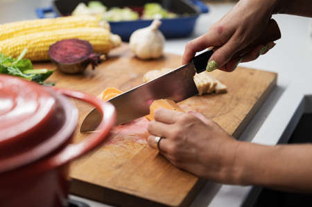 Slicing cooking carrots on wooden cutting board