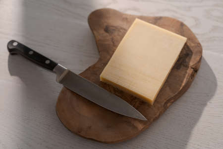 Small block of aged cheese on wood board with knife