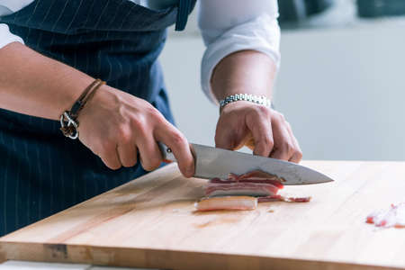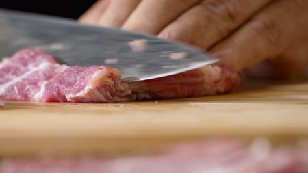 Chef sliced pork meat on cutting bord for cooking