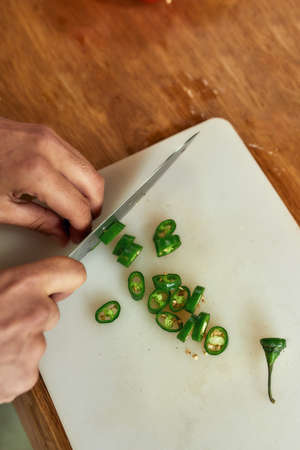 Close up shot of hands of man, chef cook slicing chili pepper with knife on chopping board