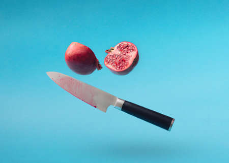 Cutted pomegranate in half in the air with a large kitchen metal knife with a black handle. Blue pastel background.