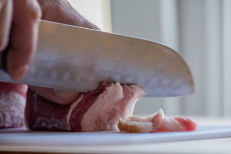 Close up of chef cutting pork meat with knife on kitchen, cooking food. The chef preparing pork meat for cooking.