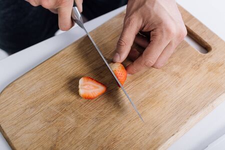 cropped view of man cutting red organic strawberry on chopping board