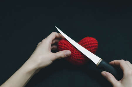 Hands of a young girl holding a red heart and a knife on a black background