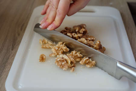 Female hand is hacking walnuts with a kitchen knife