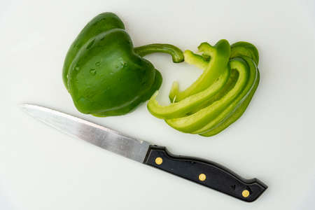 Sweet green peppers being diced in a bowl