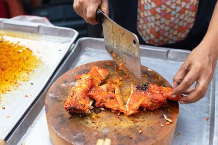 Street vendor cutting a grilled chicken marinated with curcuma on wooden cutting board, Thai street food market.