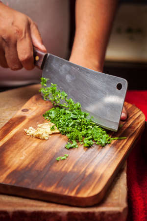 Human hands with sharp steel knife shredding green parsley leaves on wooden board for salad or stew