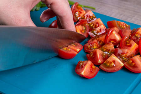 Slicing salad. Girl finely chop red tomatoes with a knife in the kitchen.