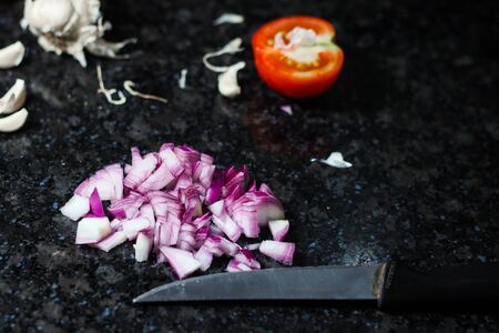 finely chopped onion and tomato and knife on granite background