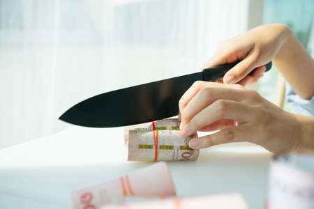 Cut cost concept. Business owner saving cost from using knife slicing banknote.